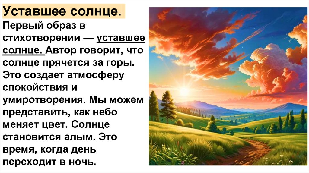 1. Мне запомнились образы уставшего солнца, уставших за день