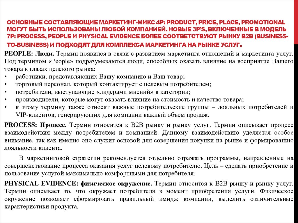 7Р: PROCESS, PEOPLE И PHYSICAL EVIDENCE БОЛЕЕ СООТВЕТСТВУЮТ РЫНКУ В2В (BUSINESSTO-BUSINESS) И ПОДХОДЯТ ДЛЯ КОМПЛЕКСА МАРКЕТИНГА НА РЫНКЕ УСЛУГ.