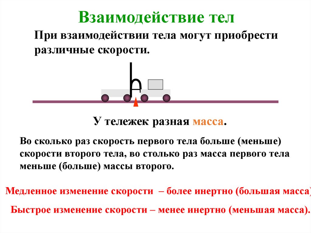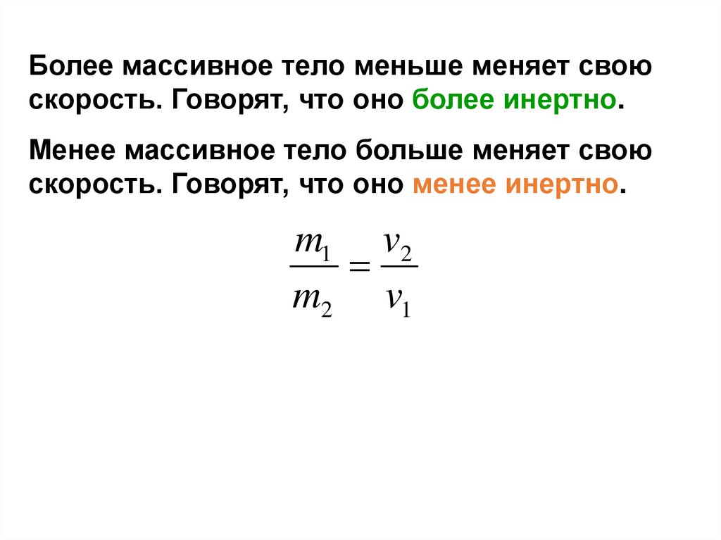 Более массивное тело меньше меняет своюскорость. Говорят, что оно более инертно.