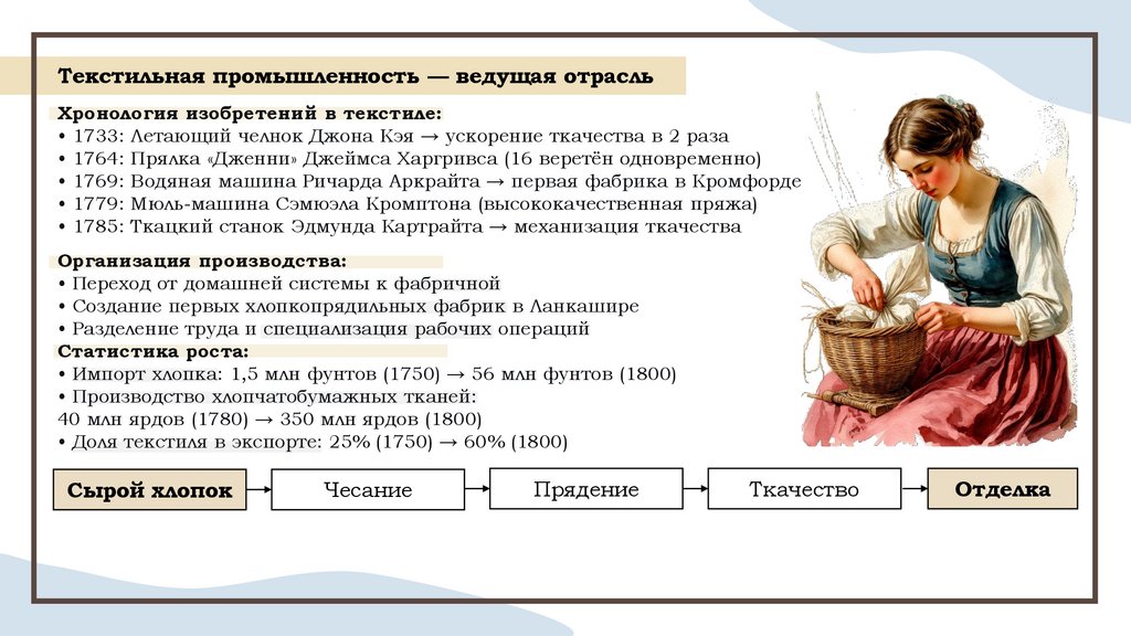 Текстильная промышленность — ведущая отрасльХронология изобретений в текстиле: