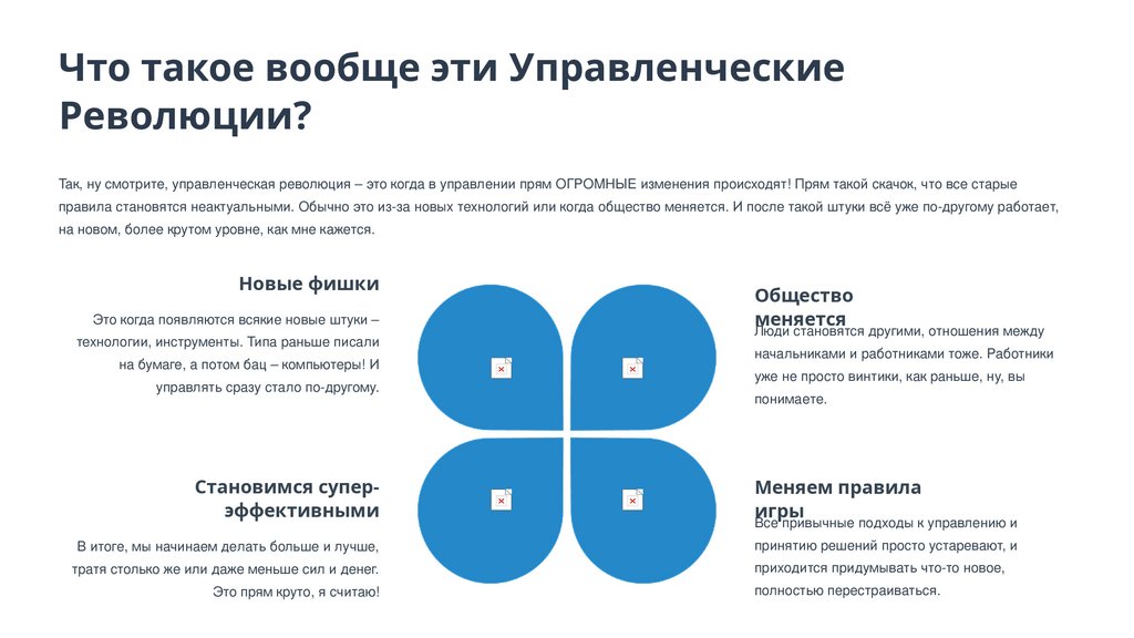 Так, ну смотрите, управленческая революция – это когда в управлении прям ОГРОМНЫЕ изменения происходят! Прям такой скачок, что все старые