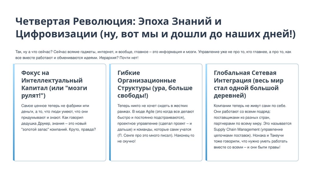 Я тут понял, что все эти революции в управлении показывают: менеджмент – это не что-то застывшее. Он постоянно меняется вместе с экономикой и