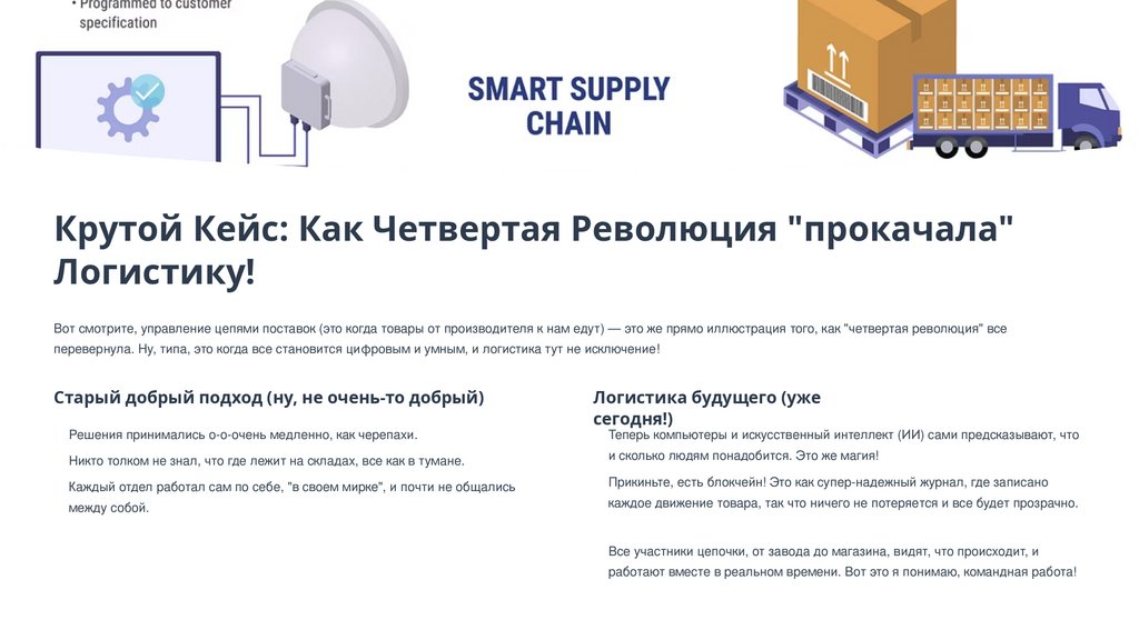 Вот смотрите, управление цепями поставок (это когда товары от производителя к нам едут) — это же прямо иллюстрация того, как "четвертая революция" все