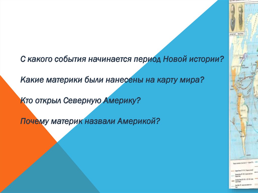 С какого события начинается период Новой истории?Какие материки были нанесены на карту мира?