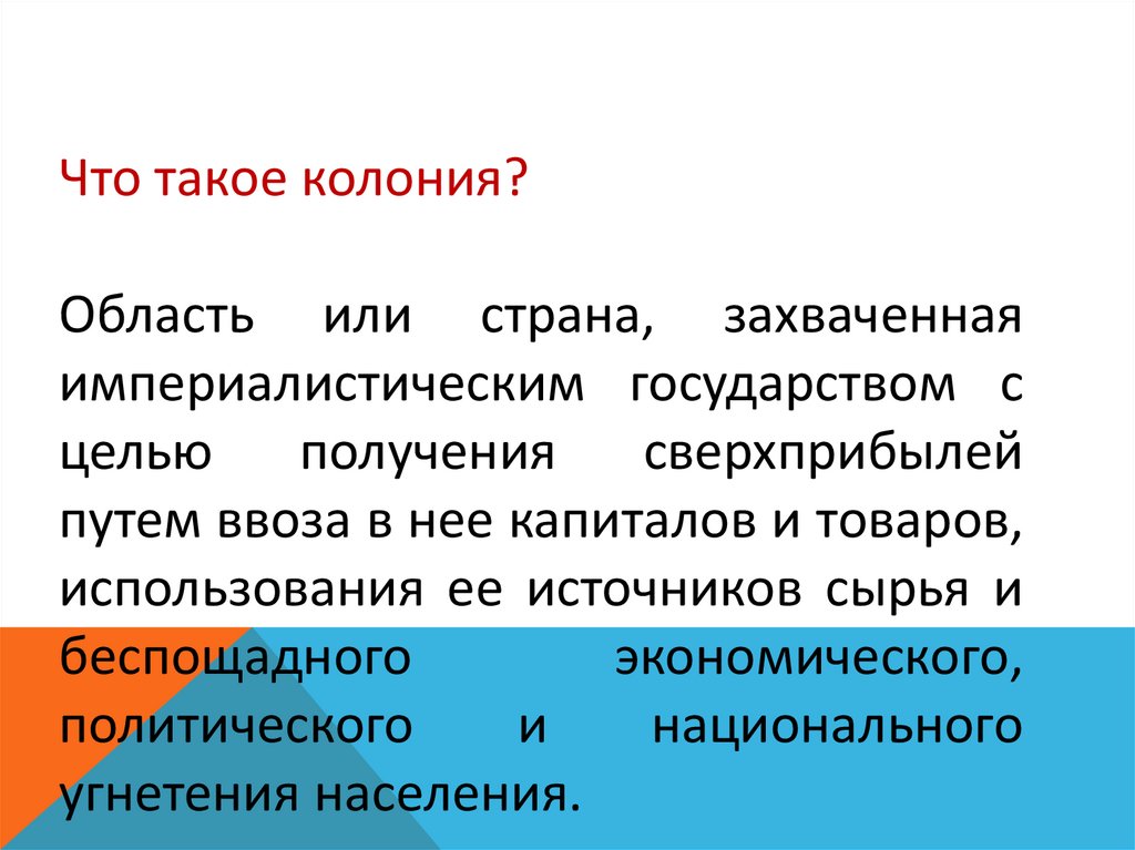 Что такое колония?Область или страна, захваченная