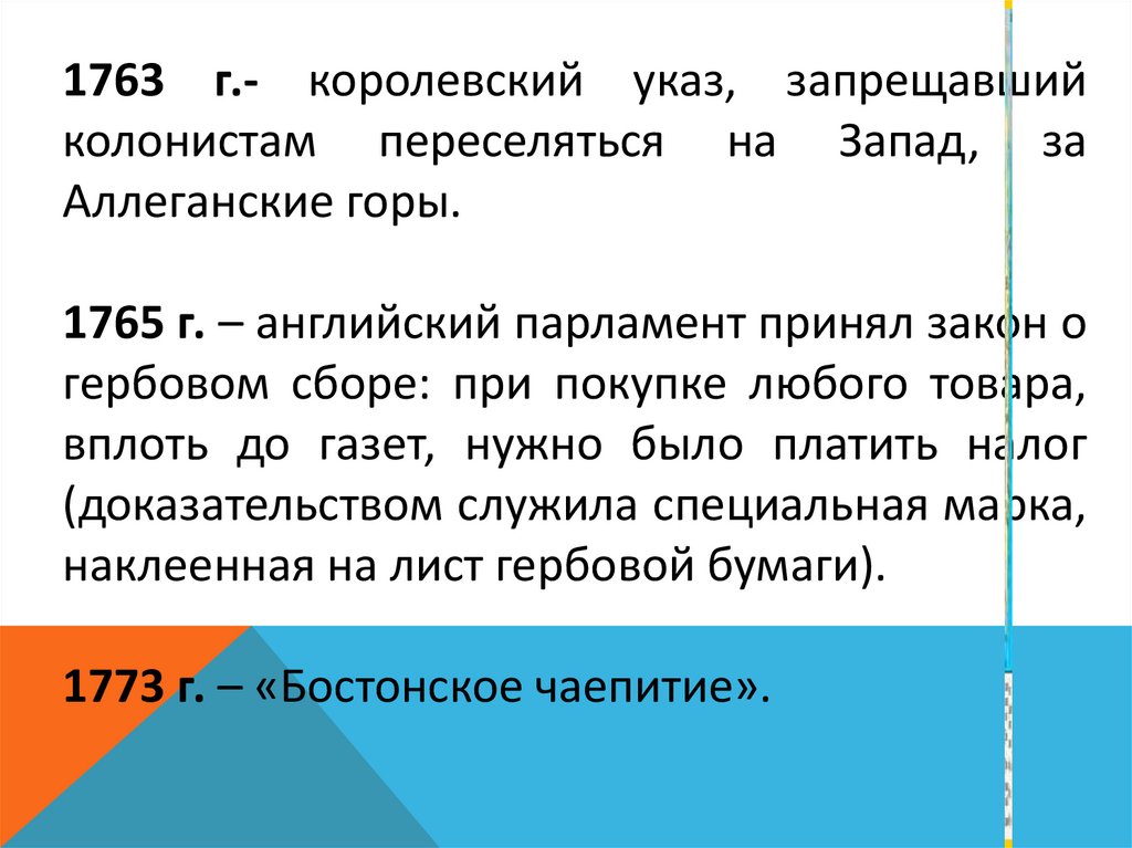 1763 г.- королевский указ, запрещавшийколонистам переселяться на Запад, за