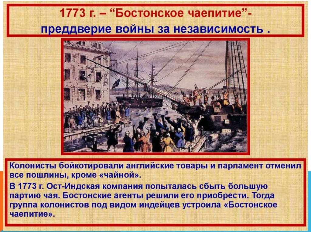 1773 г. – «Бостонское чаепитие».