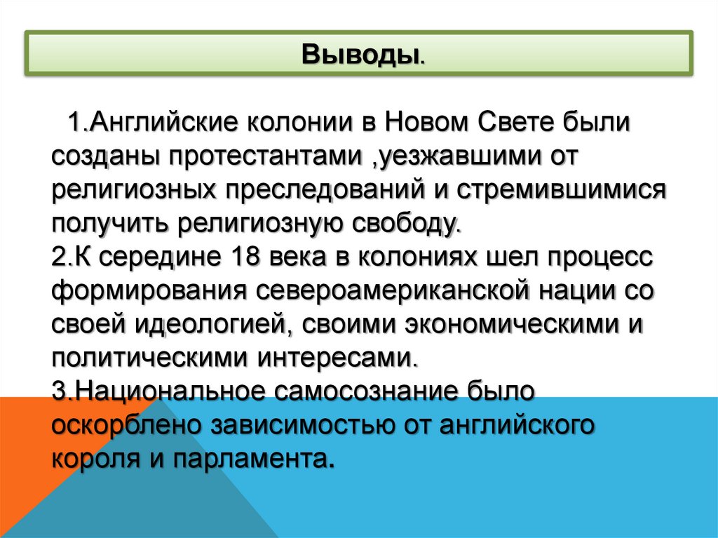 Выводы.1.Английские колонии в Новом Свете были