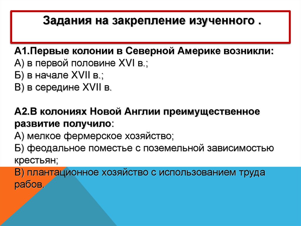 Задания на закрепление изученного .А1.Первые колонии в Северной Америке возникли: