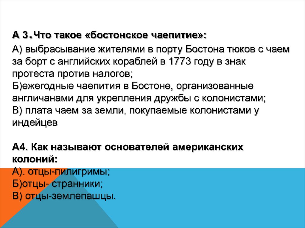 .А 3 Что такое «бостонское чаепитие»: