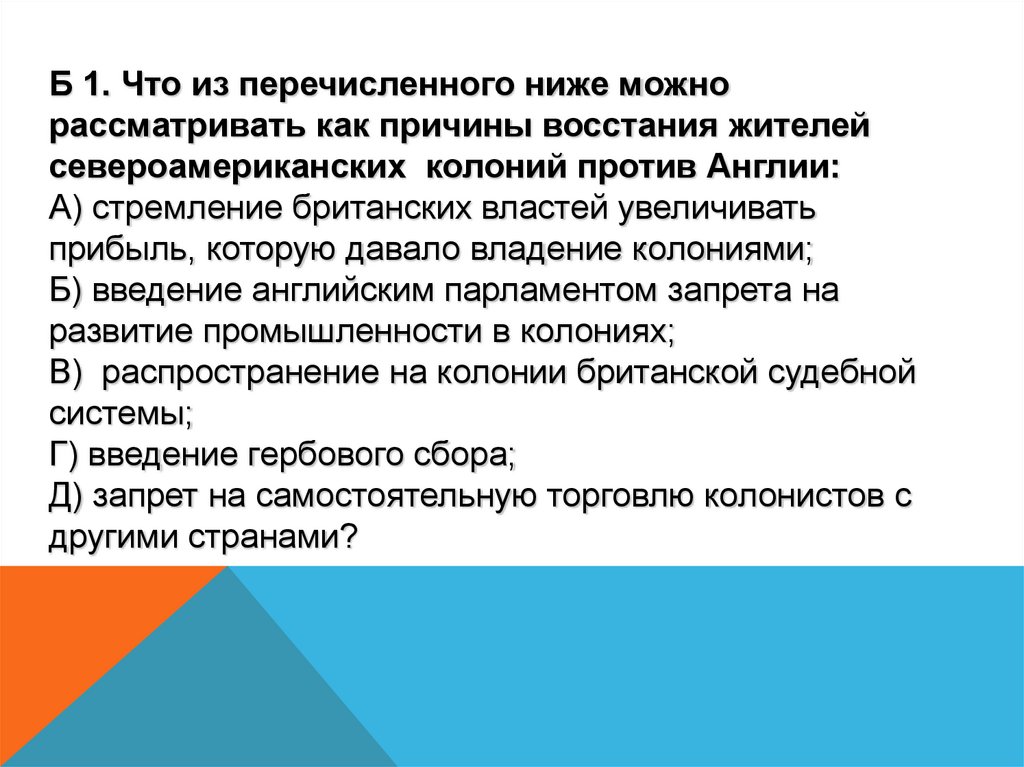 Б 1. Что из перечисленного ниже можнорассматривать как причины восстания жителей