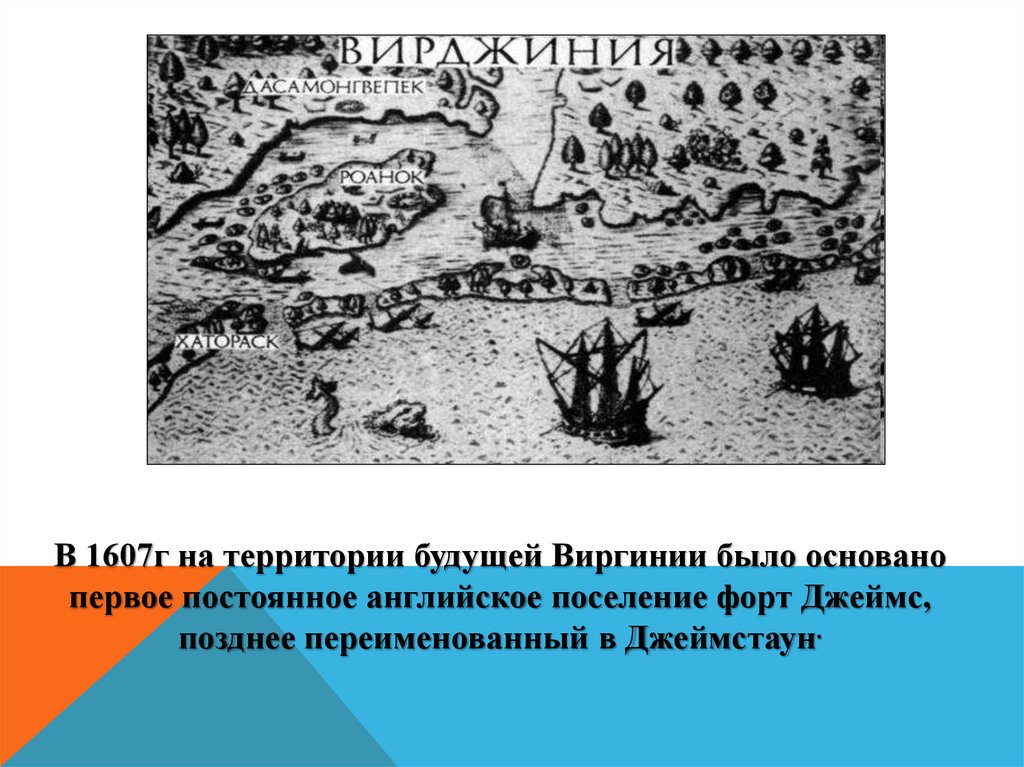 В 1607г на территории будущей Виргинии было основанопервое постоянное английское поселение форт Джеймс,
