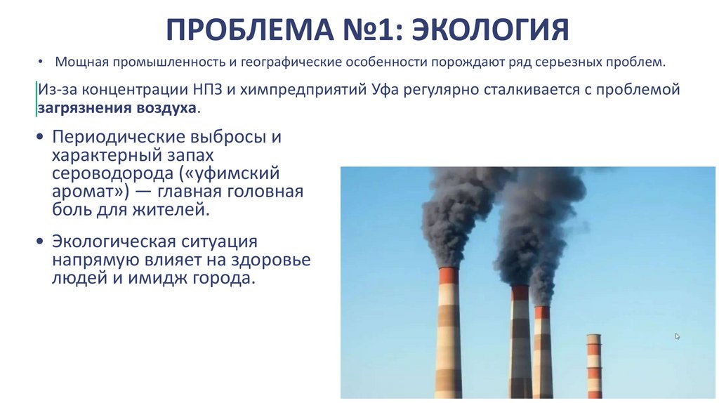 ПРОБЛЕМА №1: ЭКОЛОГИЯ• Мощная промышленность и географические особенности порождают ряд серьезных проблем.