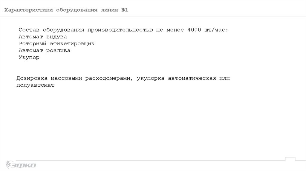 Характеристики оборудования линия №1Состав оборудования производительностью не менее 4000 шт/час: