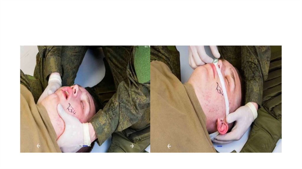 Одновременным движением выдвинуть нижнюю челюсть раненого вперед и раскрыть ему рот