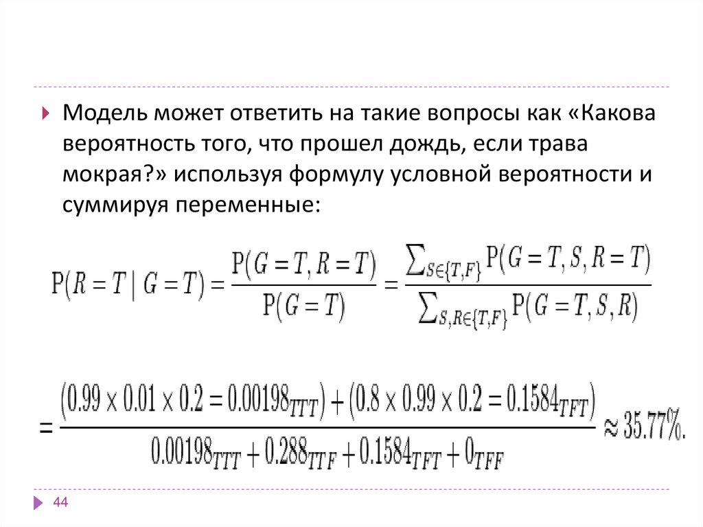 Модель может ответить на такие вопросы как «Каковавероятность того, что прошел дождь, если трава