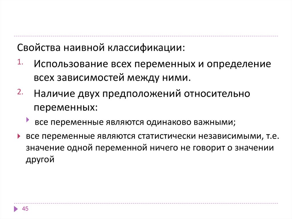 47. Наивно-байесовский подход имеет следующие недостатки: