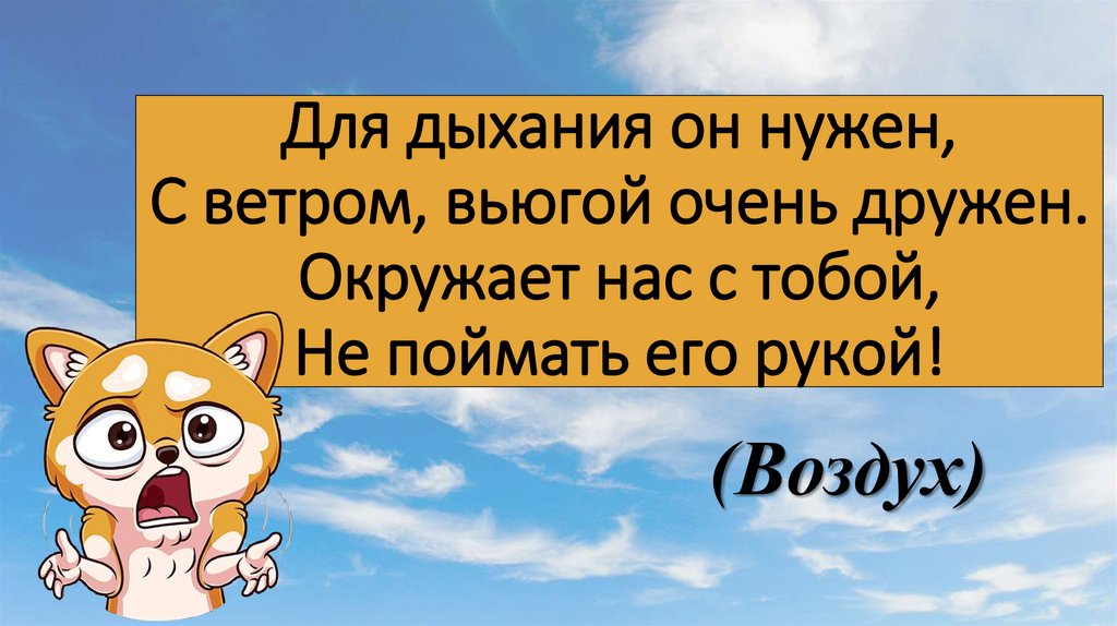 1. Для дыхания он нужен, С ветром, вьюгой очень дружен. Окружает нас с тобой, Не поймать его рукой!