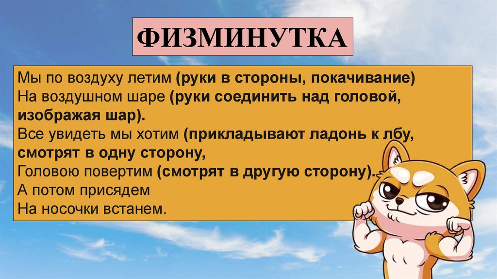 ФИЗМИНУТКАМы по воздуху летим (руки в стороны, покачивание)