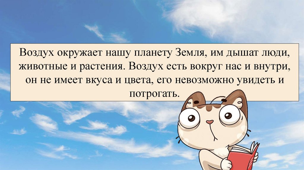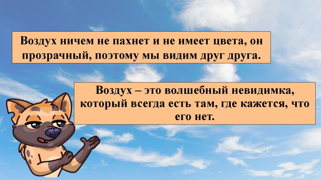 Воздух ничем не пахнет и не имеет цвета, онпрозрачный, поэтому мы видим друг друга.