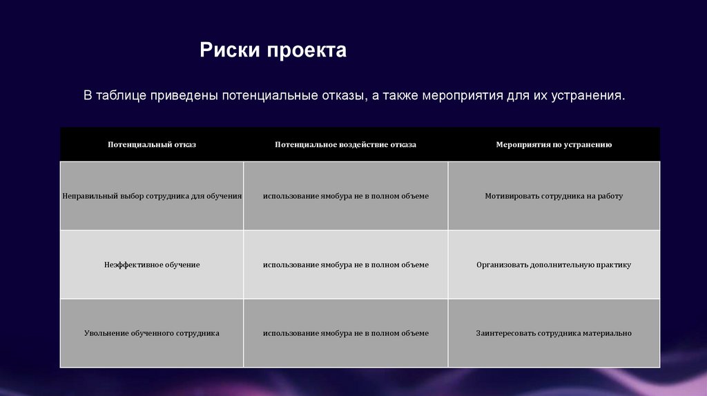 Риски проектаВ таблице приведены потенциальные отказы, а также мероприятия для их устранения.