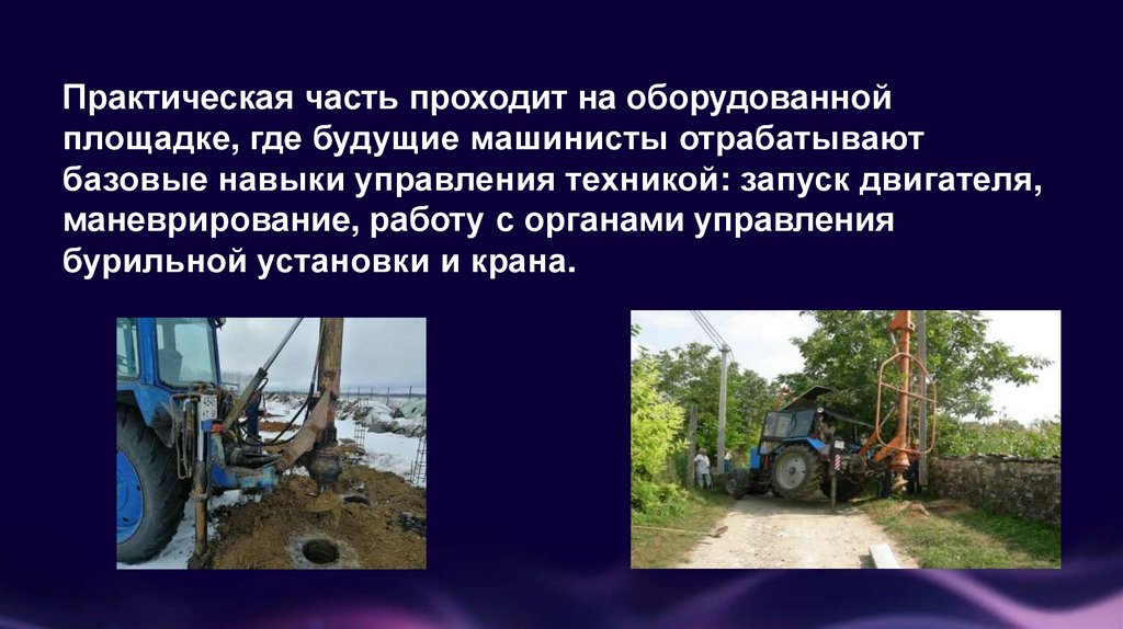 Практическая часть проходит на оборудованнойплощадке, где будущие машинисты отрабатывают