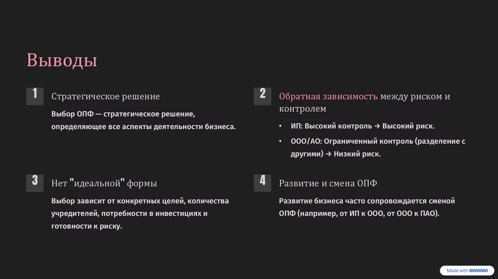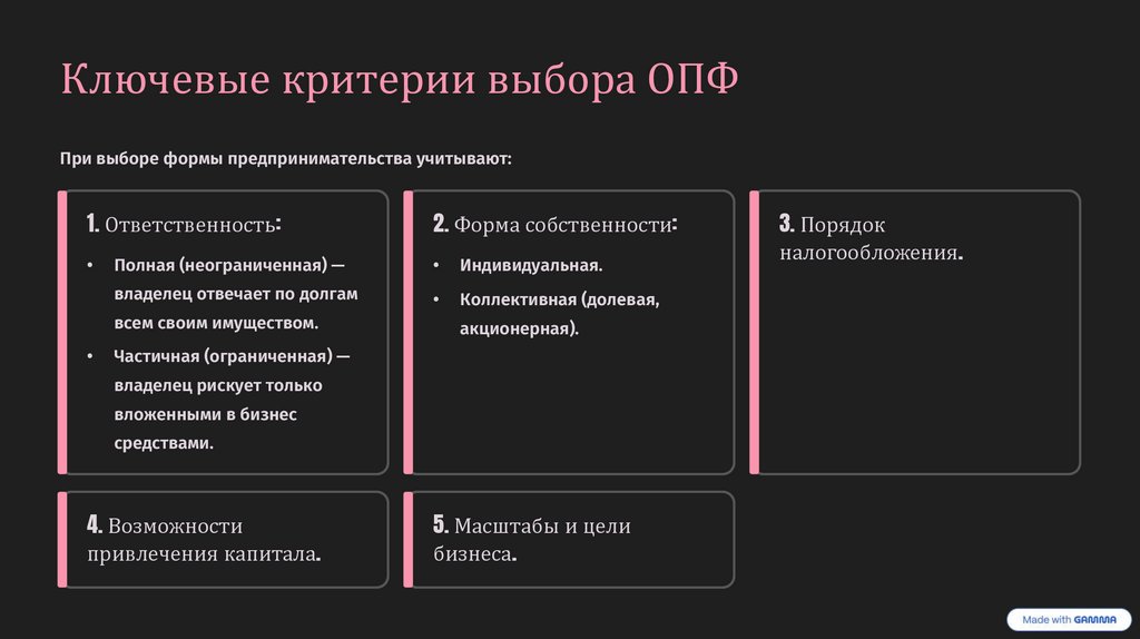 Ключевые критерии выбора ОПФПри выборе формы предпринимательства учитывают: