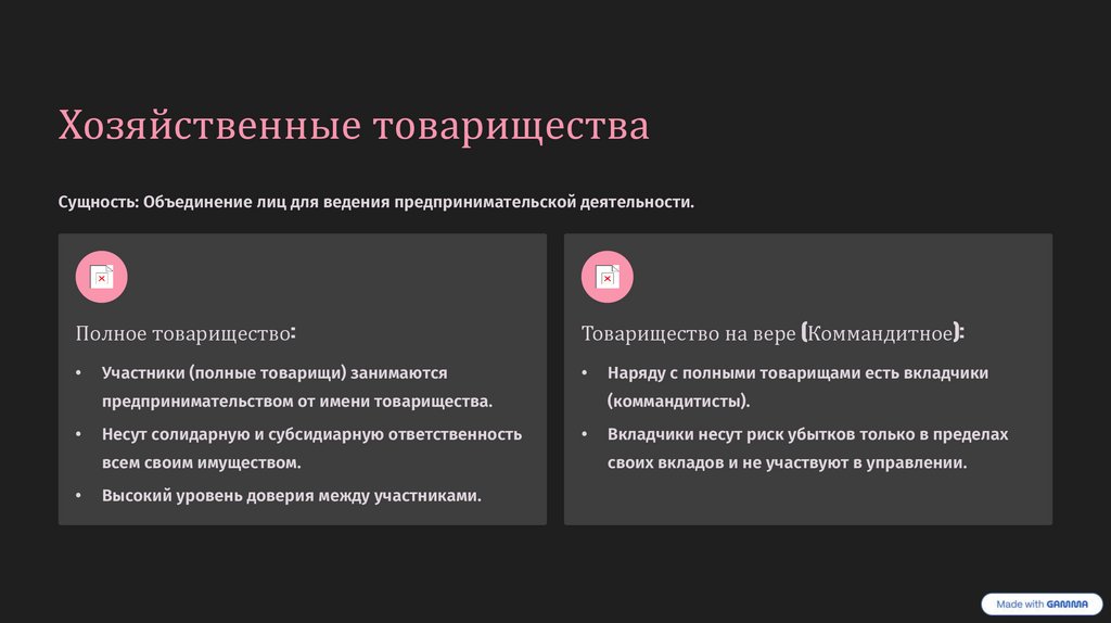 Хозяйственные товариществаСущность: Объединение лиц для ведения предпринимательской деятельности.
