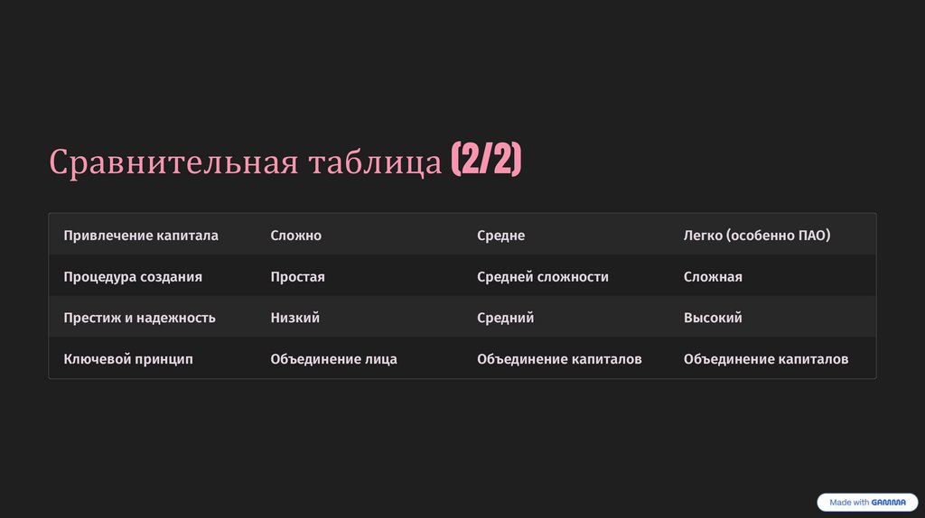 Сравнительная таблица (2/2)Привлечение капитала
