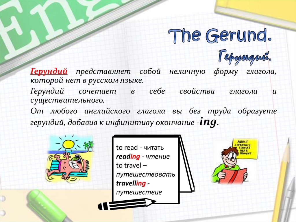 Герундий представляет собой неличную форму глагола,которой нет в русском языке.