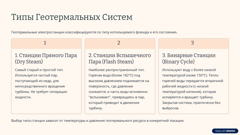 Выбор типа станции зависит от температуры и давления геотермального ресурса в конкретной локации.