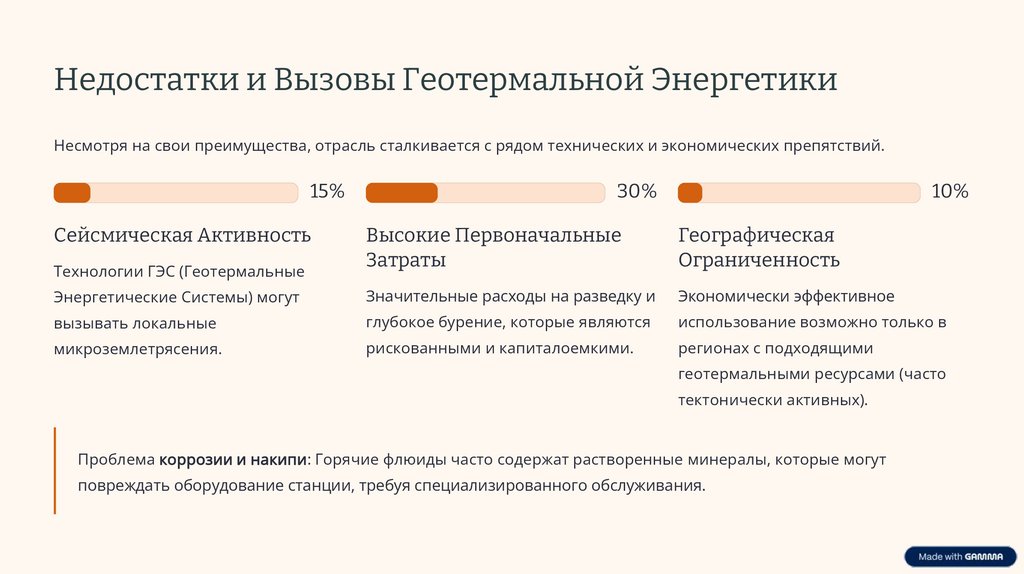 Недостатки и Вызовы Геотермальной ЭнергетикиНесмотря на свои преимущества, отрасль сталкивается с рядом технических и экономических препятствий.