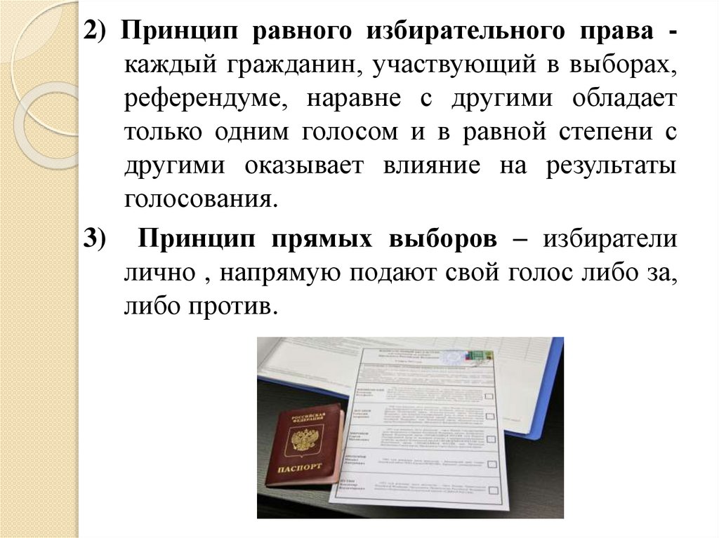 2) Принцип равного избирательного права каждый гражданин, участвующий в выборах,референдуме, наравне с другими обладает
