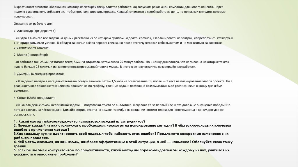 1. Какие методы тайм-менеджмента использовали герои и были ли допущены ошибки с их стороны?