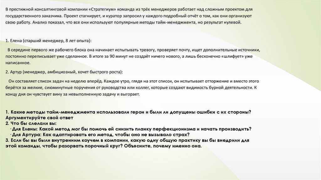 В престижной консалтинговой компании «Стратегиум» команда из трёх менеджеров работает над сложным проектом длягосударственного заказчика. Проект стагнирует, и куратор запросил у каждого подробный отчёт о том, как они организуют