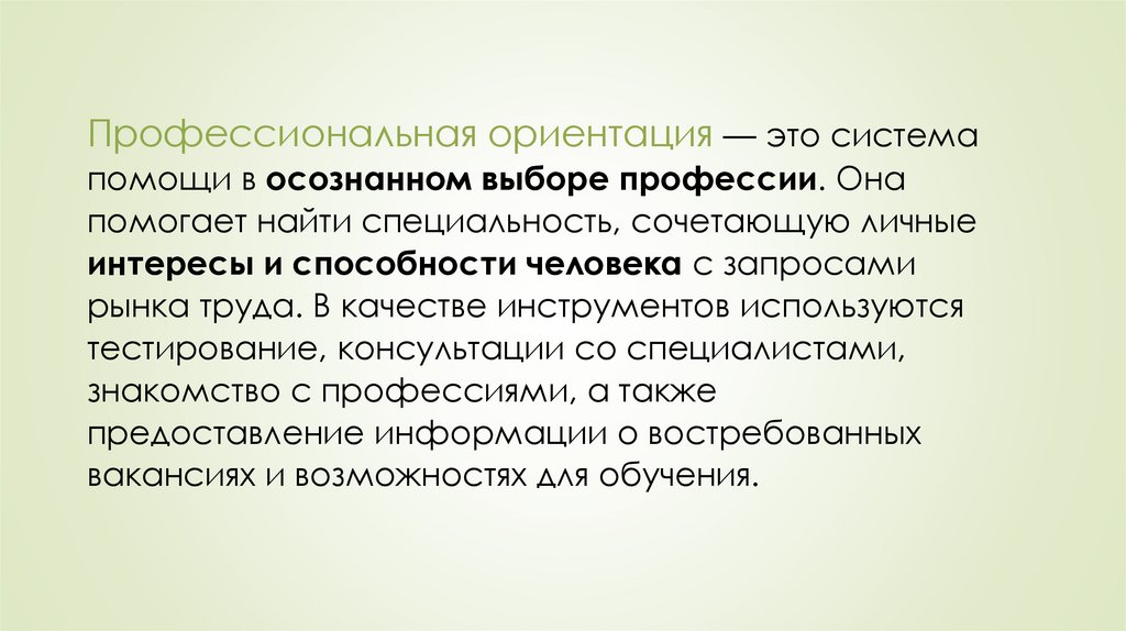 Профессиональная ориентация — это системапомощи в осознанном выборе профессии. Она