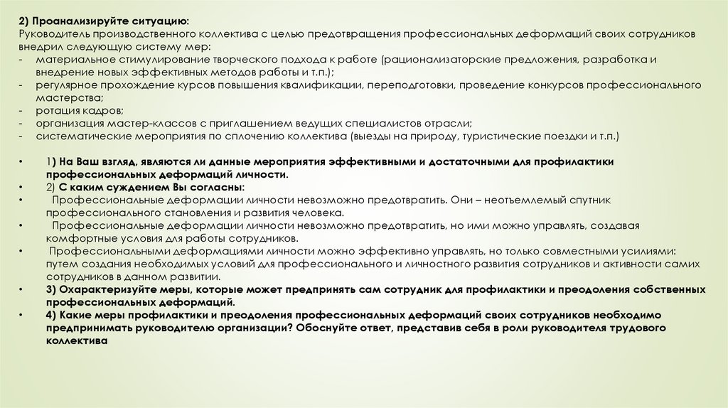 2) Проанализируйте ситуацию:Руководитель производственного коллектива с целью предотвращения профессиональных деформаций своих сотрудников