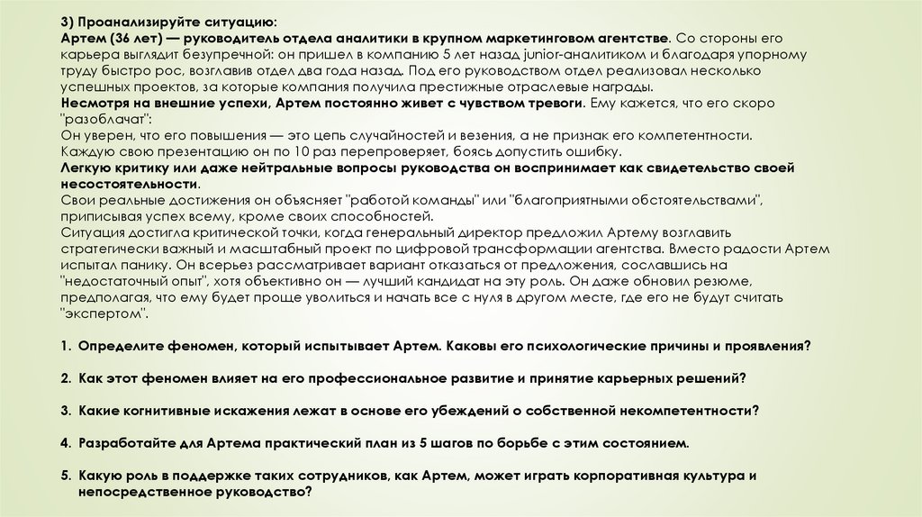 3) Проанализируйте ситуацию:Артем (36 лет) — руководитель отдела аналитики в крупном маркетинговом агентстве. Со стороны его