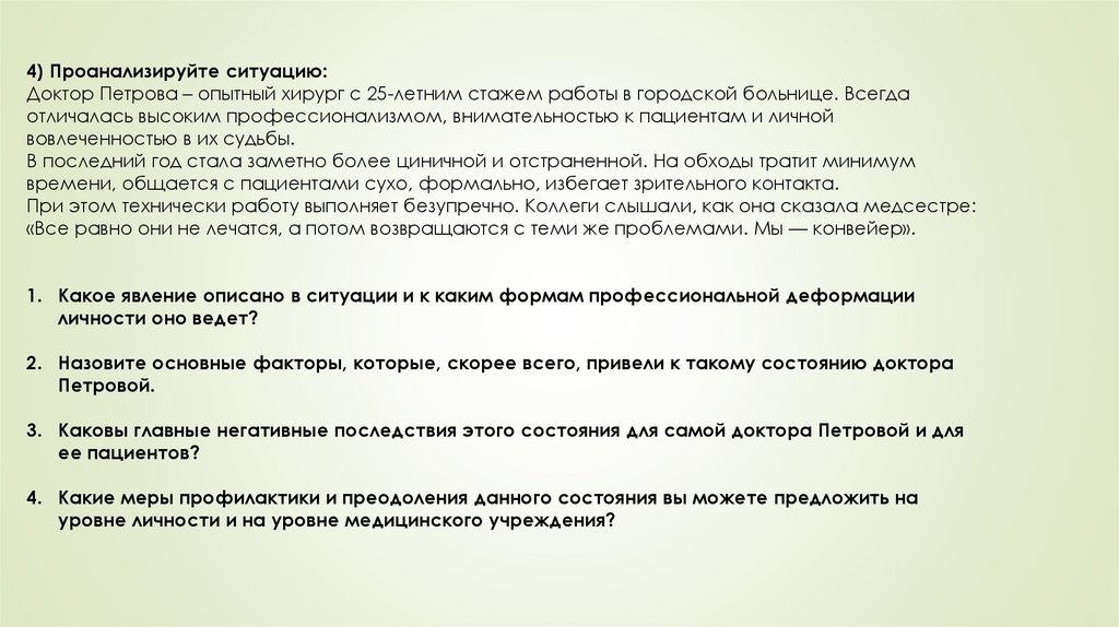 4) Проанализируйте ситуацию:Доктор Петрова – опытный хирург с 25-летним стажем работы в городской больнице. Всегда