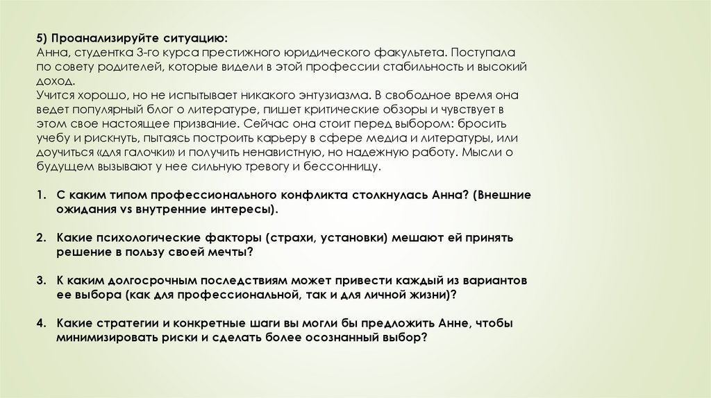 5) Проанализируйте ситуацию:Анна, студентка 3-го курса престижного юридического факультета. Поступала