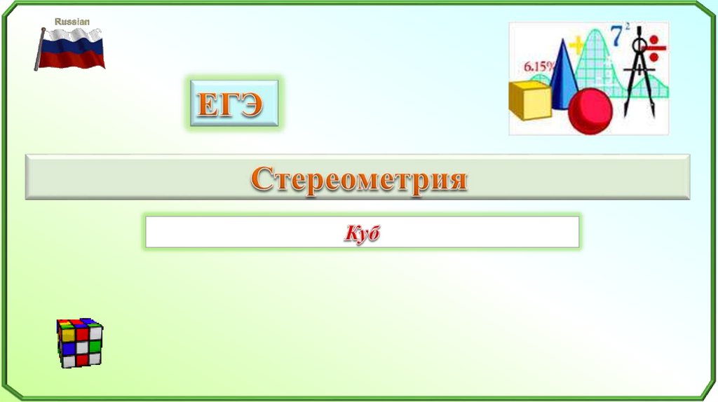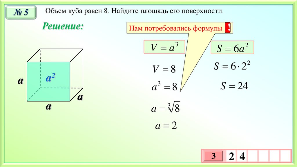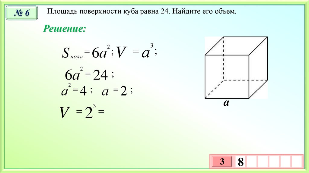 №6Площадь поверхности куба равна 24. Найдите его объем.