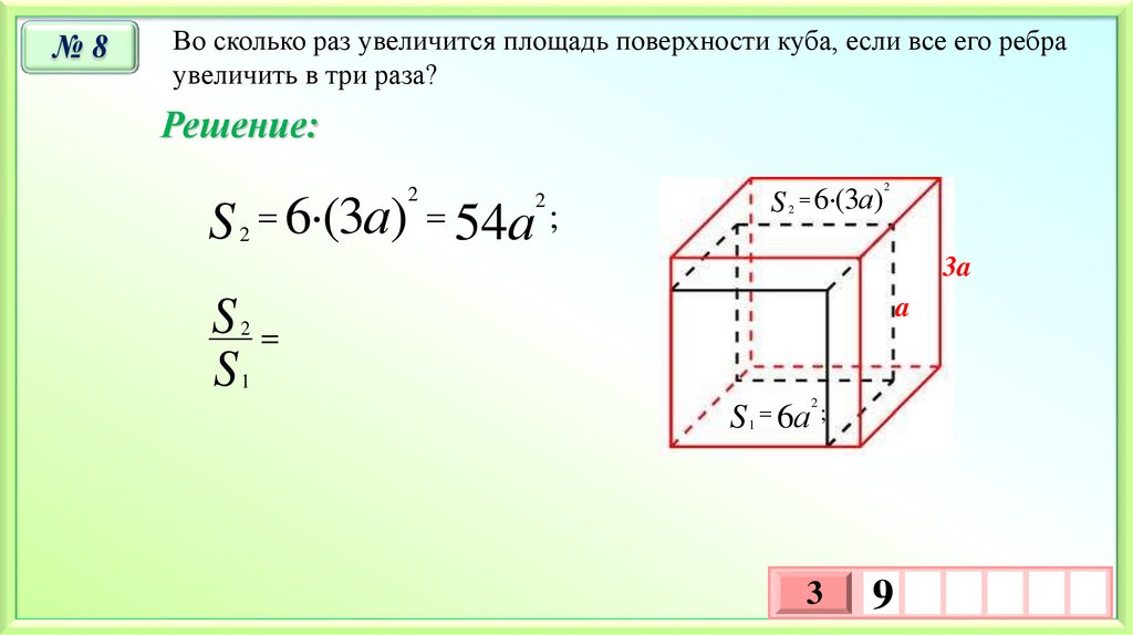 №8Во сколько раз увеличится площадь поверхности куба, если все его ребра