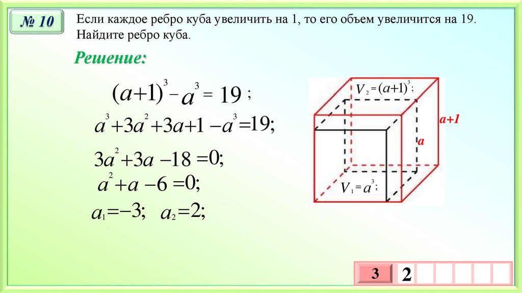 № 10Если каждое ребро куба увеличить на 1, то его объем увеличится на 19.