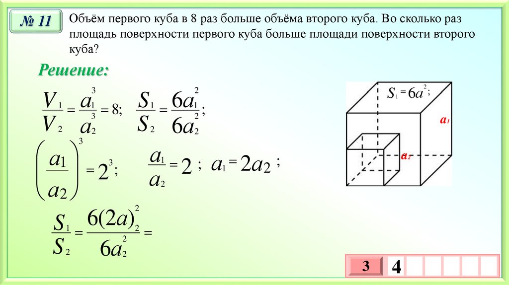 Объём первого куба в 8 раз больше объёма второго куба. Во сколько разплощадь поверхности первого куба больше площади поверхности второго