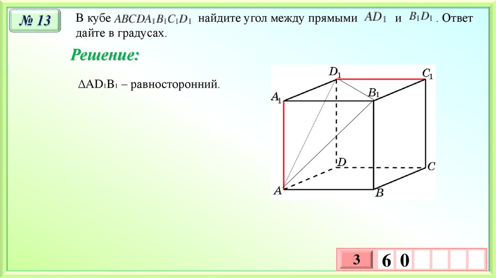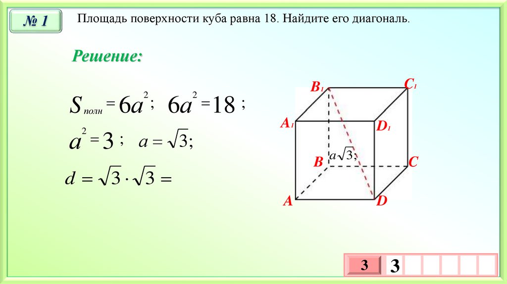 №1Площадь поверхности куба равна 18. Найдите его диагональ.