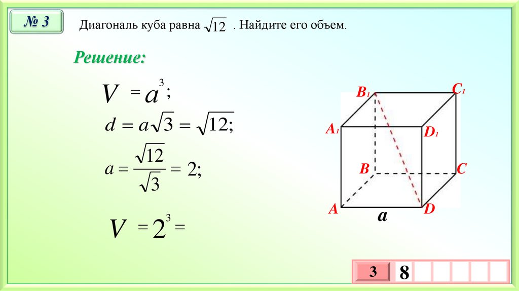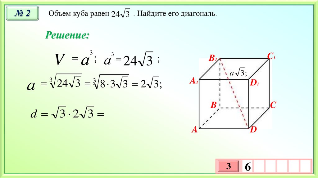 №2Объем куба равен 24 3 . Найдите его диагональ.