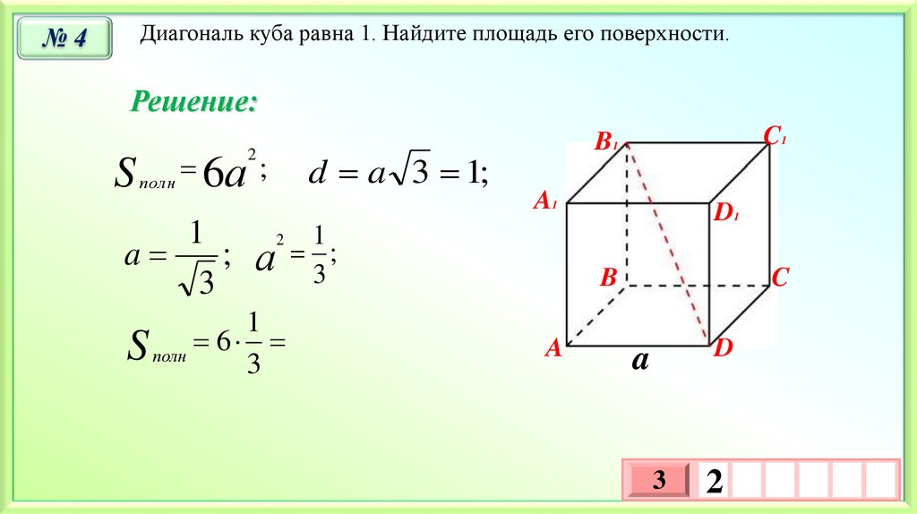 Диагональ куба равна 1. Найдите площадь его поверхности.№4