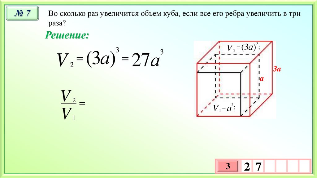 №7Во сколько раз увеличится объем куба, если все его ребра увеличить в три