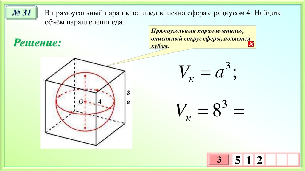 № 31В прямоугольный параллелепипед вписана сфера с радиусом 4. Найдите