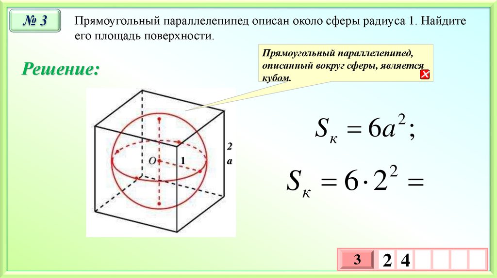 №3Прямоугольный параллелепипед описан около сферы радиуса 1. Найдите